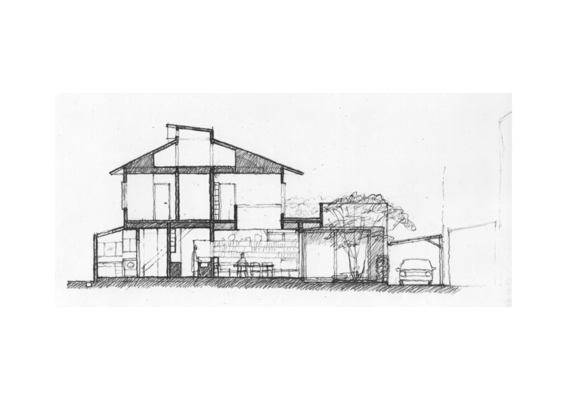 作品一覧敷地が狭く周辺が建て込んでいることから、プライバシィを確保する意味で中庭型の平面とした。中庭は約4.5m四方と狭いので、それに面する居間上部を吹抜けとし、庭の樹木をタテに見せることを意図した。同時に吹抜けを通じて家族がコミュニケーションを取れ、夏、風が家の中を通り抜けることを意図している。