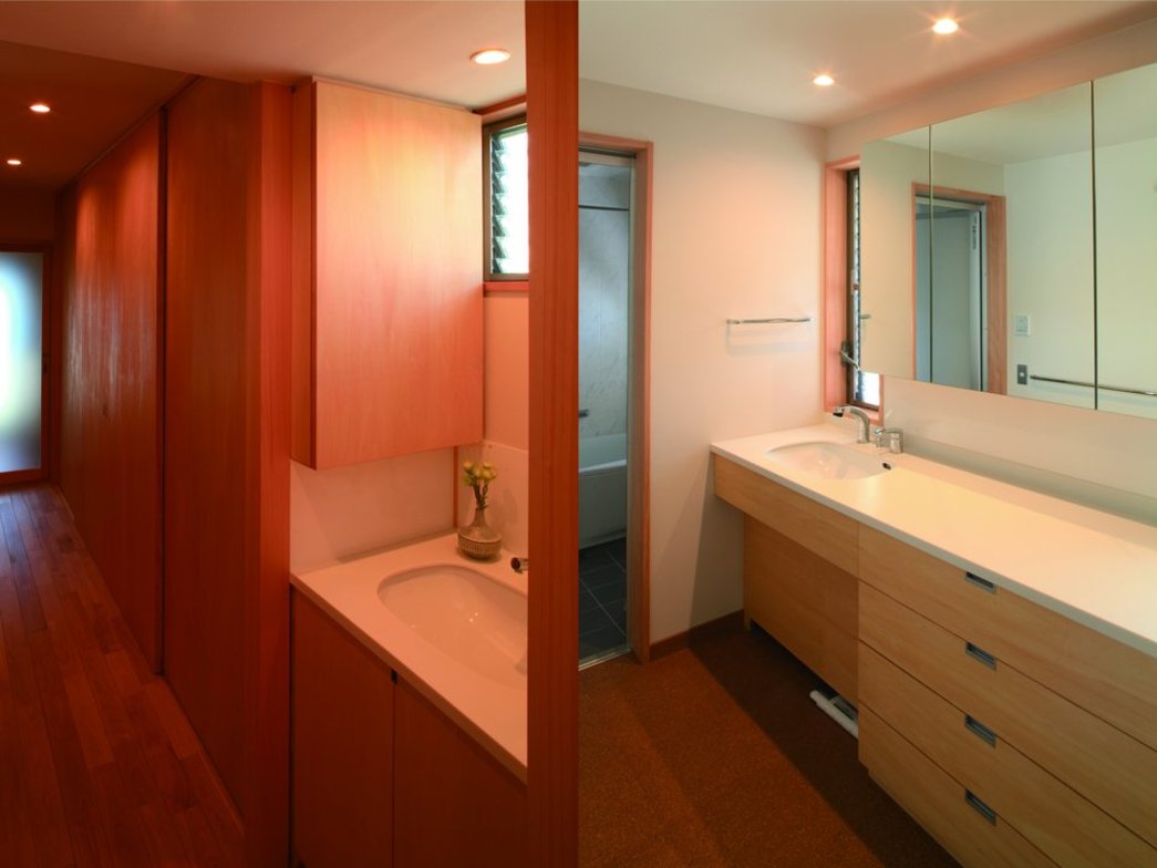 廊下に設けた手洗い所と、廊下の突き当たりにある洗面所