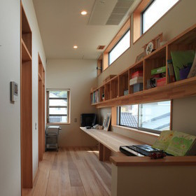 どの部屋も太陽の恵みにあずかれるよう南側に出来るだけ広い庭をとり、入口のある東側から奥にいくほどプライバシーが高まるリニアな平面計画とした。リビングは天井高の高い開放的な空間として、そのロフト部分を子供達のプレイルームとしている。