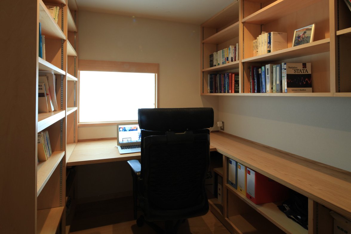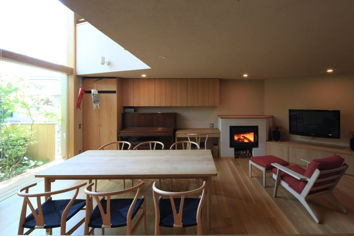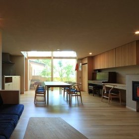 敷地は大阪市北部の丘陵地に広く展開する住宅地の一画にあり、敷地内には約2mの高低差があった。道路沿いに新たな擁壁をつくることで、土地を有効に使い、高低差を利用してプライバシーを確保する計画とした。家の南側には2台分のカーポートが必要だったため、庭の面積は限定されたが、南に面する吹き抜けの開口部前面に高木を植えることで、十分な緑が楽しめるように計画している。