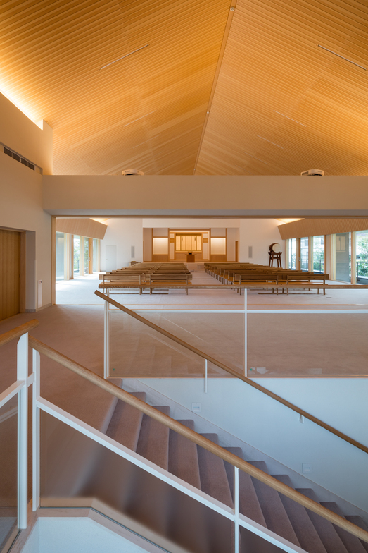 1階部分は日々の活動や研修などに使われる諸室を配し、2階を礼拝のための場とした。会の教義の核心である自然の恵みに対する感謝を表すために、建物の周辺はできるだけ緑化し、将来は森の中にあるような環境づくりを目指した。また、外観・内観共に宗教施設としての厳然とした姿を保ちながら、日々の生活を暖かく包み込み、周辺に対しても違和感の少ない大きな家のような雰囲気とすることを心掛けた。