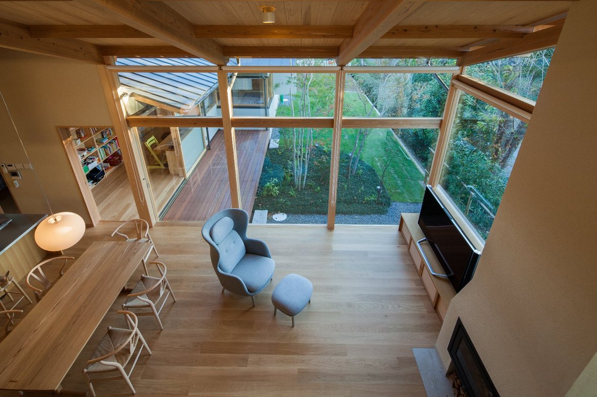 作品一覧つくば市の郊外に建つ夫婦と子ども2人のための家。敷地は南北に長細く、西側が広い緑地公園に面しているため、公園側に開かれた中庭を持つセミコートハウスとして計画した。1階のリビング・ダイニングに接して家族4人のスタディーコーナーを設け、子ども達はここで勉強し、吹抜けでつながった2階の個室は寝るときに使うようにした。主寝室は将来を考え水廻りに近く、陽当たりの良い1階南側に設けている。
