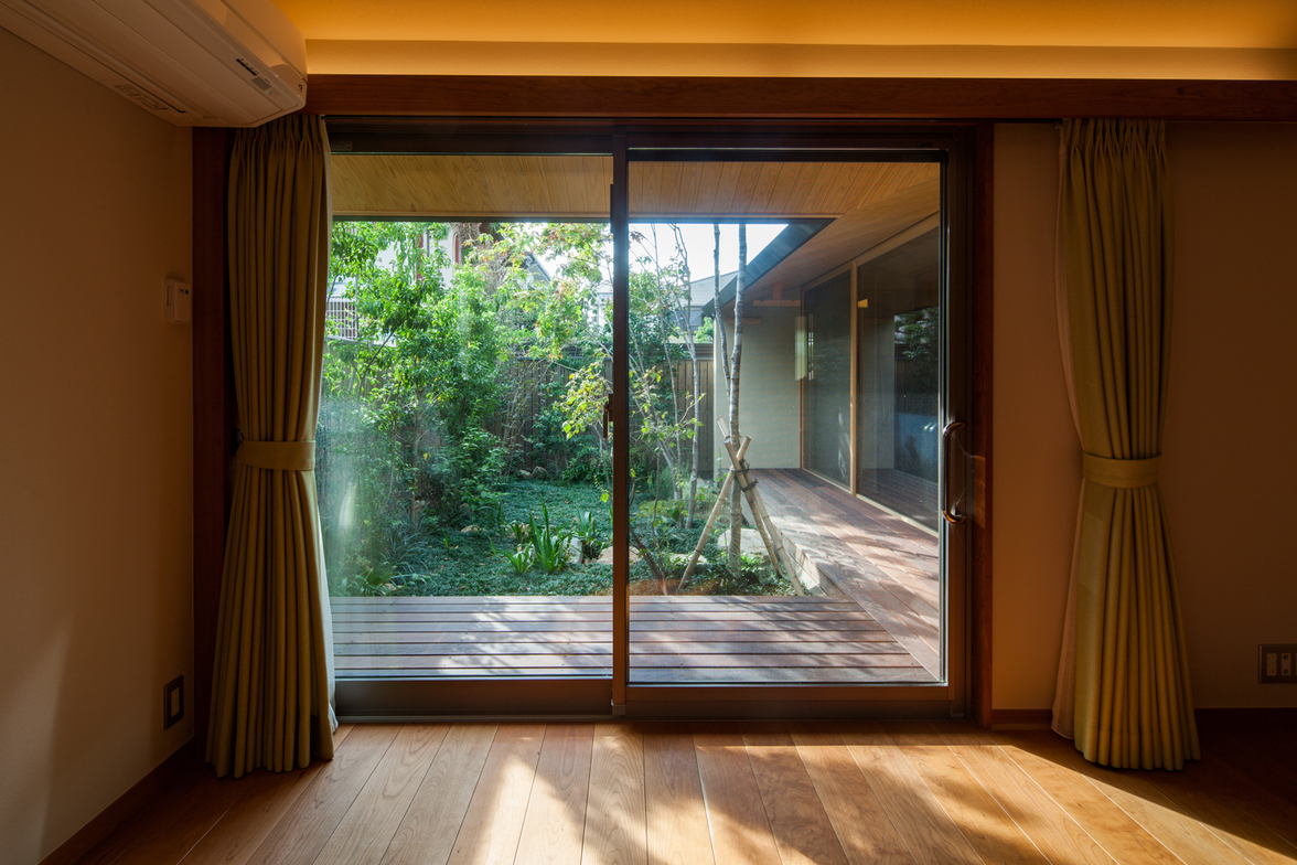 作品一覧阪神間の閑静な住宅地に建つ壮年の夫婦のための家。1階はLDKと水回りのほかに将来の親の介護や自らが老いたときの寝室として用いるための洗面所付きの予備室を設けている。2階は和室と寝室とし、ダイニングの上部に小さな吹抜けを設けて上下階の気配がつながるようにした。庭はプライバシーを確保したうえで家の中から花や緑が楽しめるように隣家との間に木塀を立て、中庭的な雰囲気のものとした。