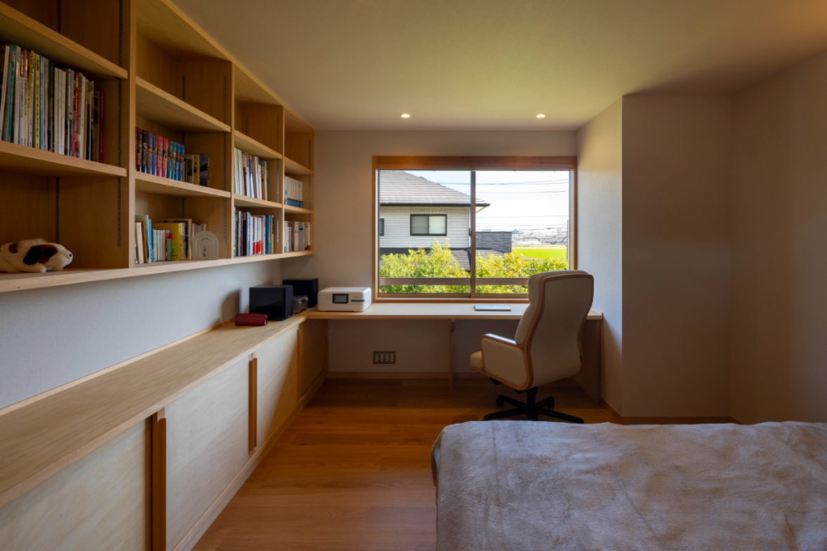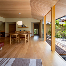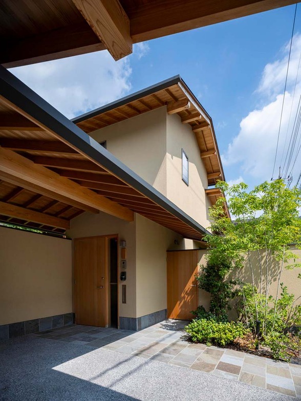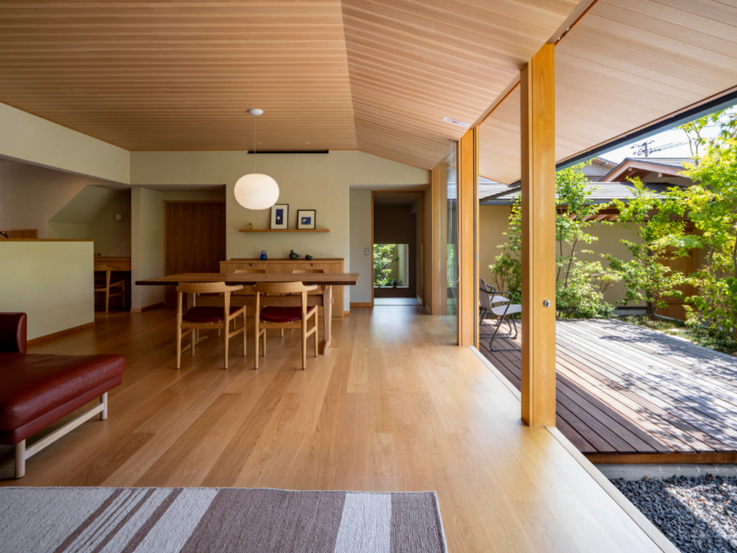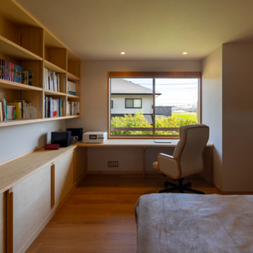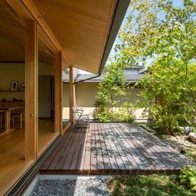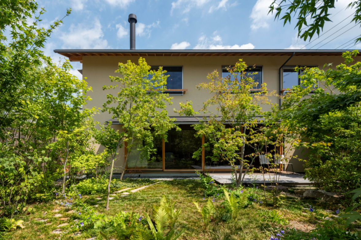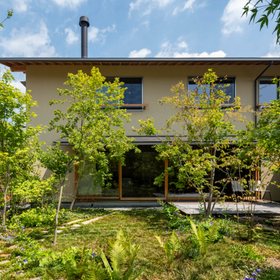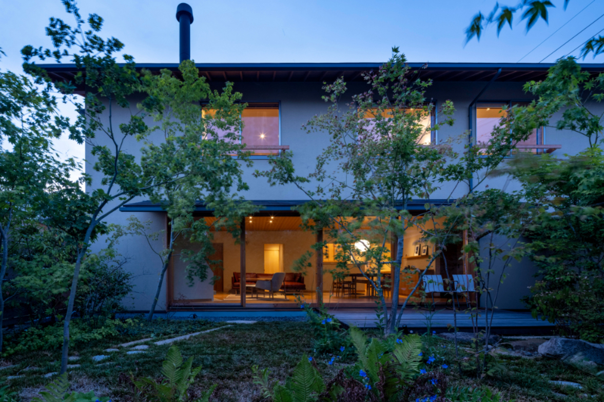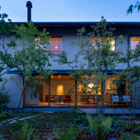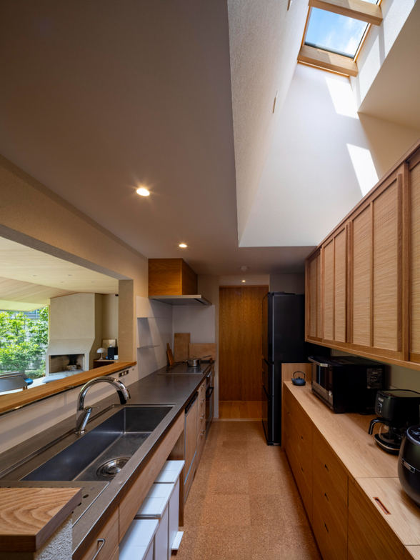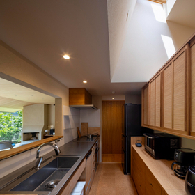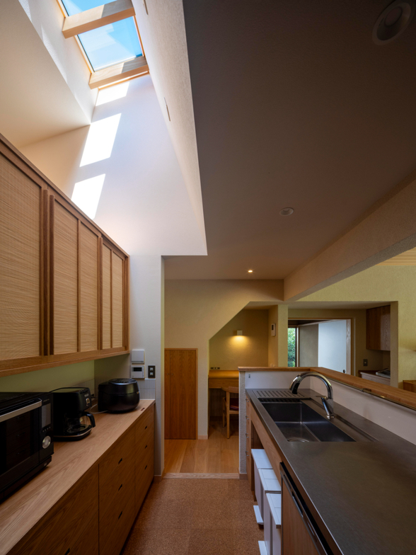 作品一覧岡山市北部の閑静な住宅地に建つ家。温熱の効率を上げ、家事動線を集約するために平面はワンボリュームとし、北側の隣家への日照に配慮して南側に2階を乗せる構成とした。台所は家全体の家事動線の要になるようにプランのほぼ中央に配置し、その北側に水廻り諸室を設けている。それらの部屋や廊下は暗くなりがちなので台所の背面の屋根に天窓を設けて陰気にならないように断面の計画をした。