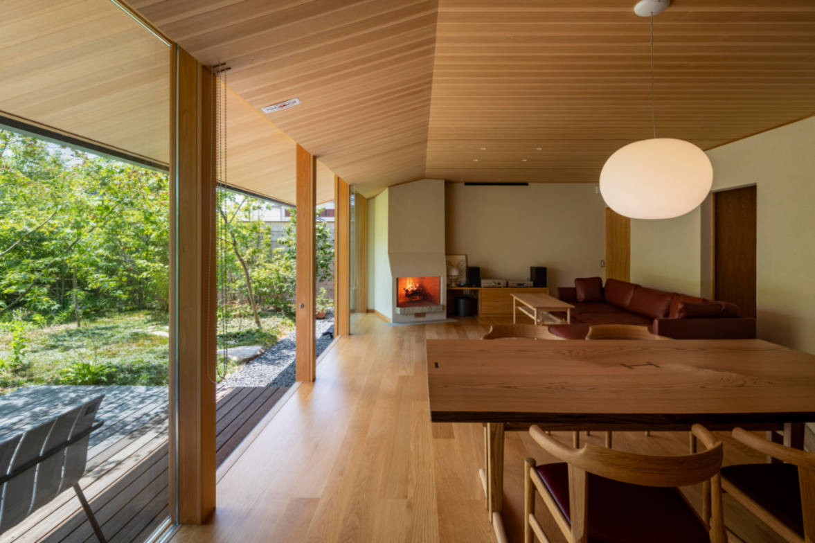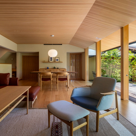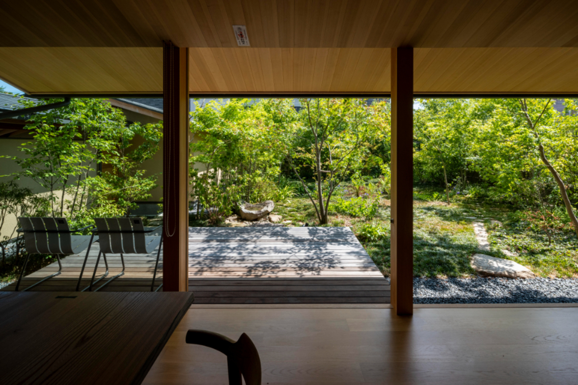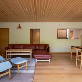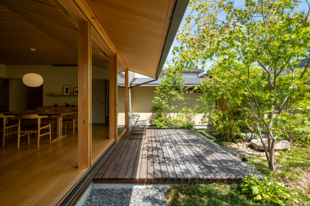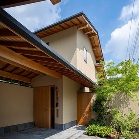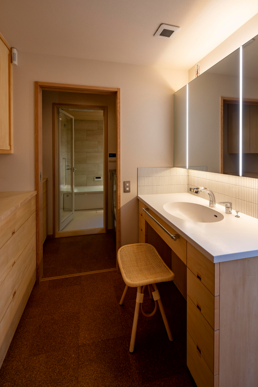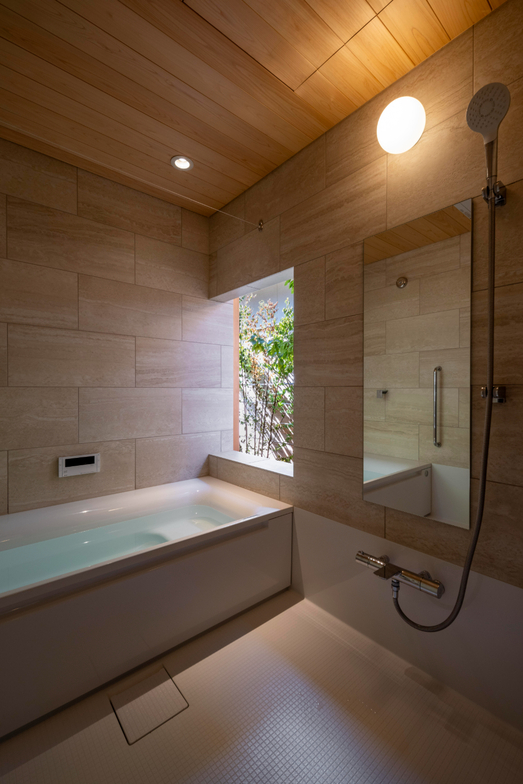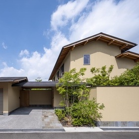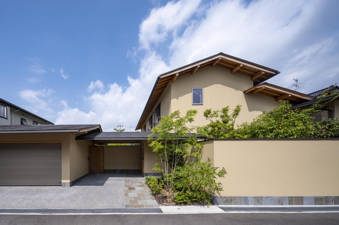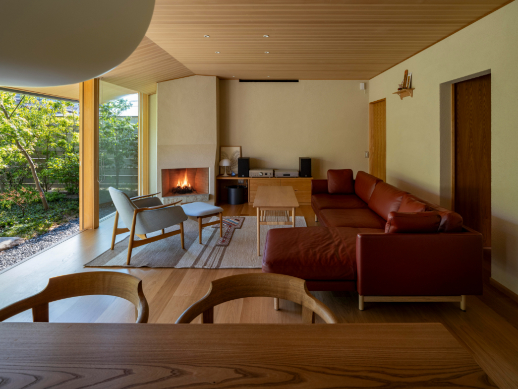 作品一覧岡山市北部の閑静な住宅地に建つ家。温熱の効率を上げ、家事動線を集約するために平面はワンボリュームとし、北側の隣家への日照に配慮して南側に2階を乗せる構成とした。台所は家全体の家事動線の要になるようにプランのほぼ中央に配置し、その北側に水廻り諸室を設けている。それらの部屋や廊下は暗くなりがちなので台所の背面の屋根に天窓を設けて陰気にならないように断面の計画をした。