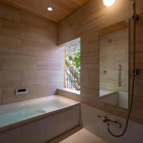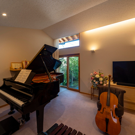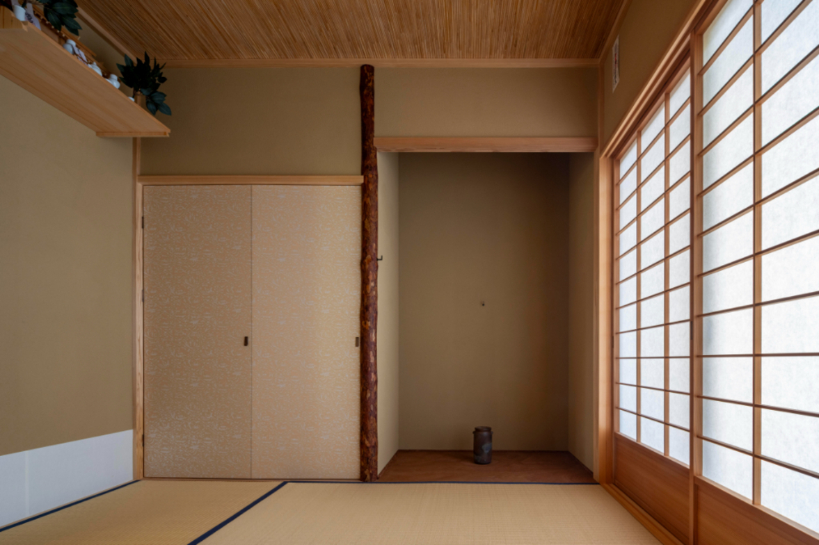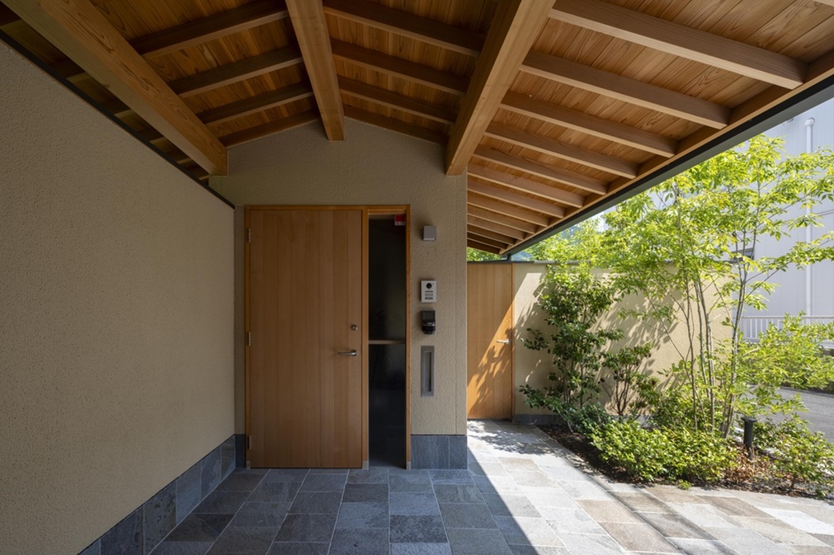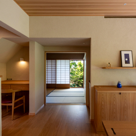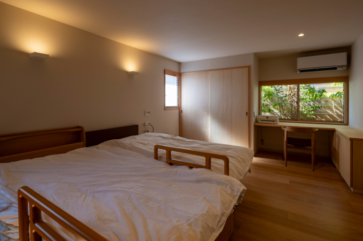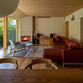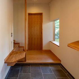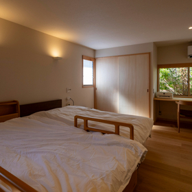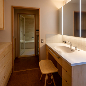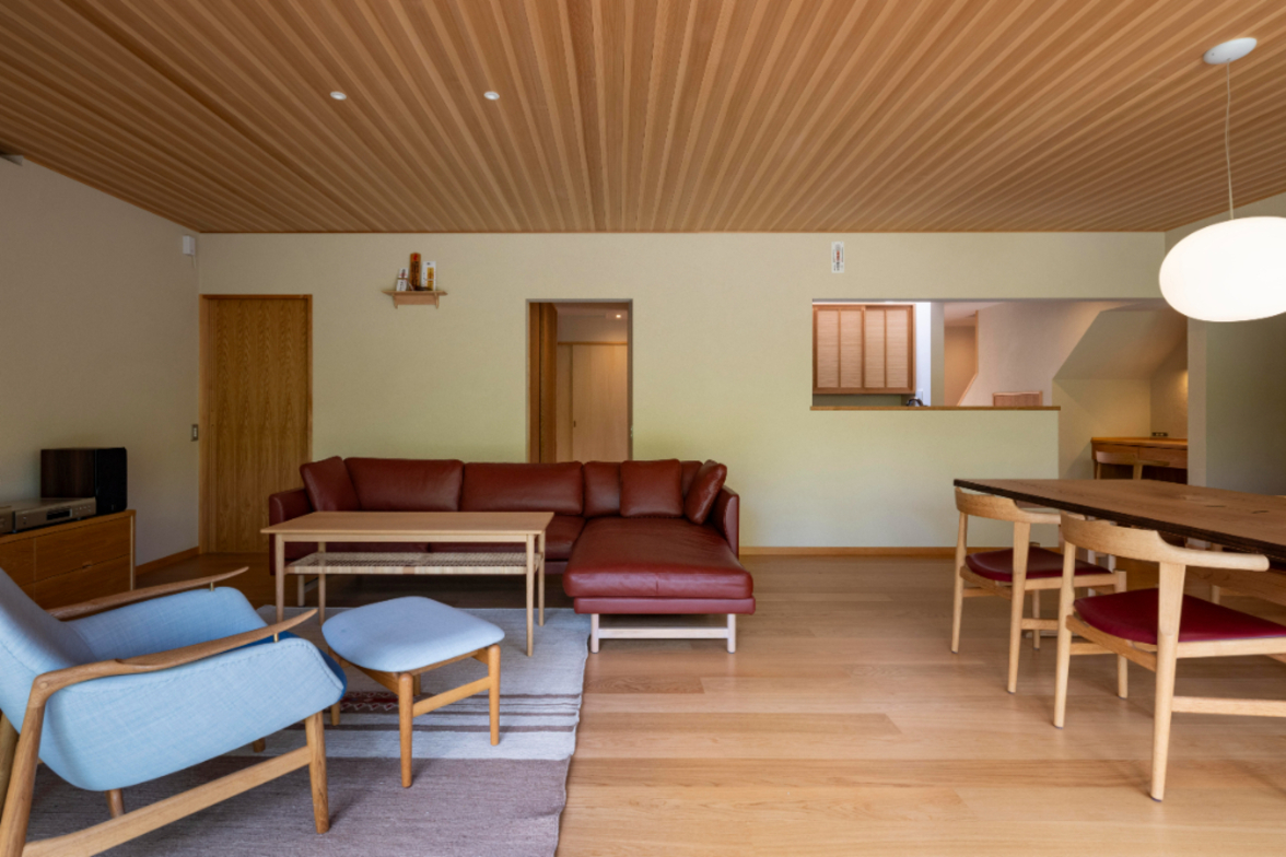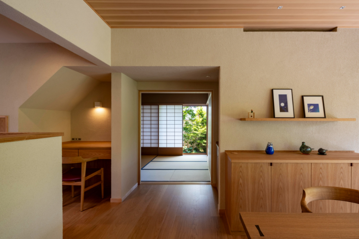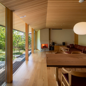 作品一覧岡山市北部の閑静な住宅地に建つ家。温熱の効率を上げ、家事動線を集約するために平面はワンボリュームとし、北側の隣家への日照に配慮して南側に2階を乗せる構成とした。台所は家全体の家事動線の要になるようにプランのほぼ中央に配置し、その北側に水廻り諸室を設けている。それらの部屋や廊下は暗くなりがちなので台所の背面の屋根に天窓を設けて陰気にならないように断面の計画をした。