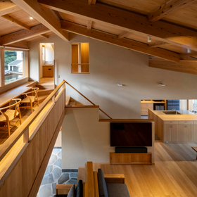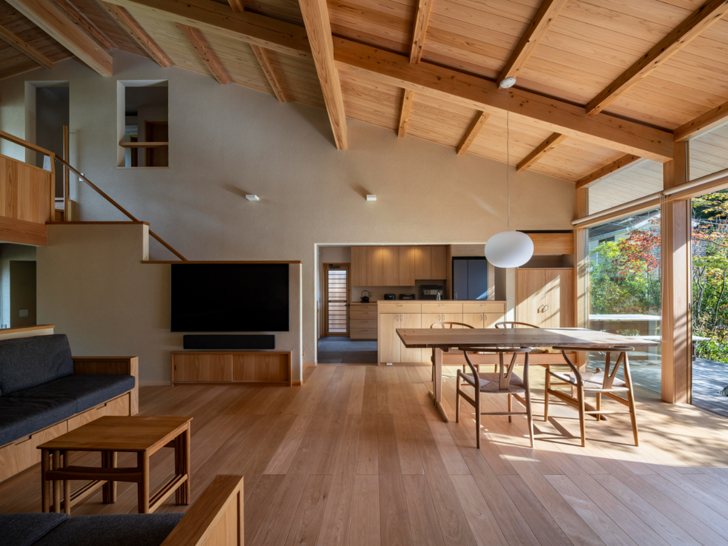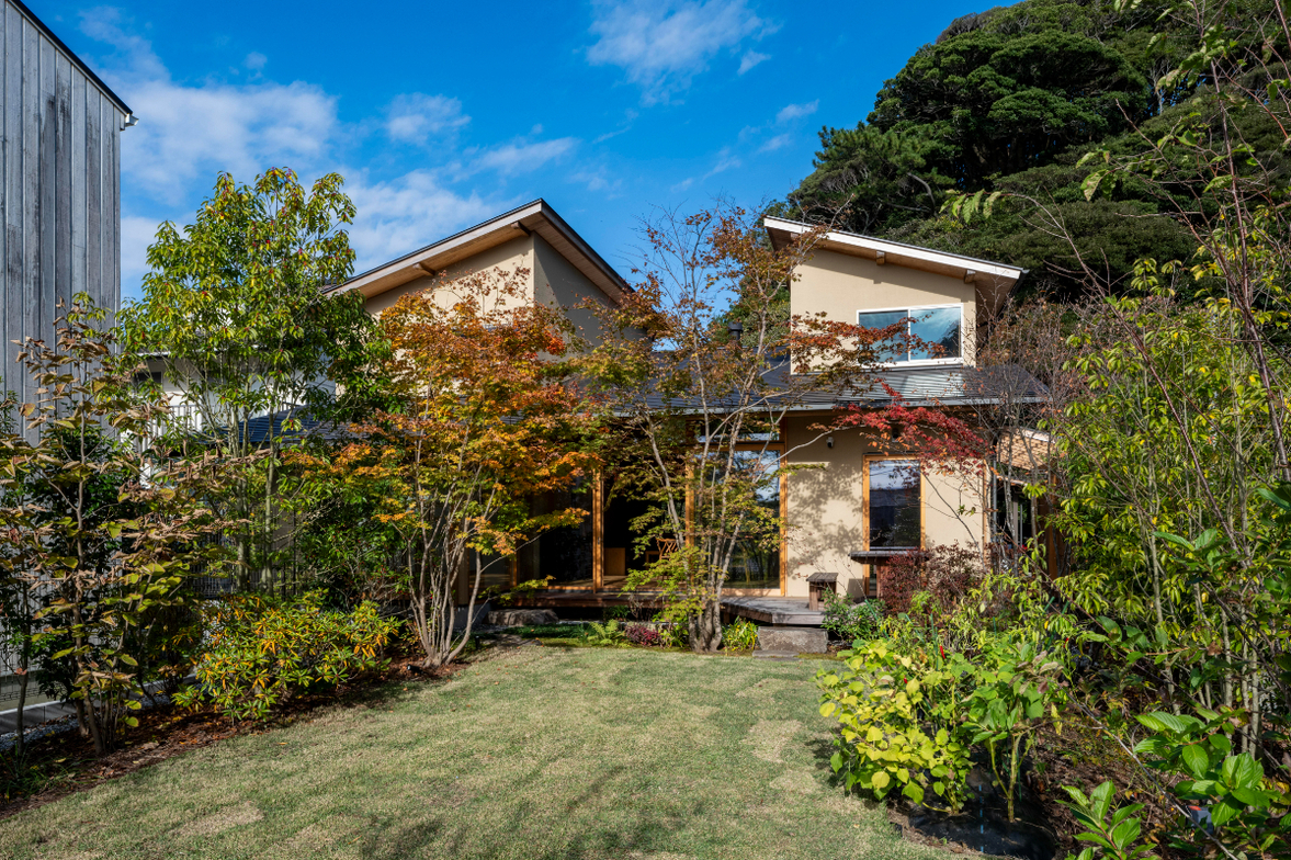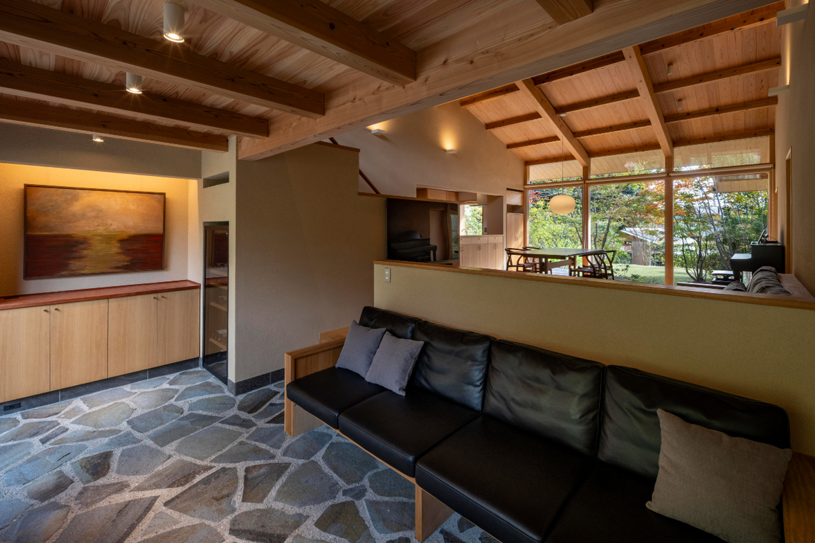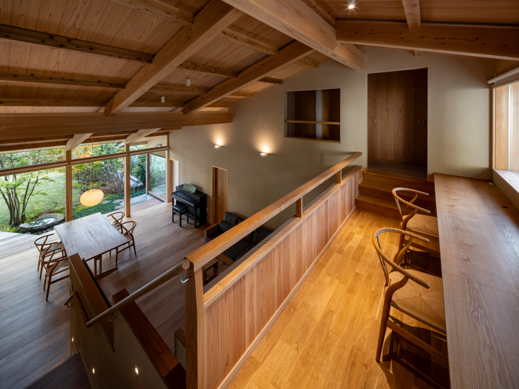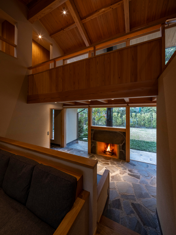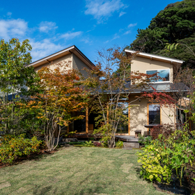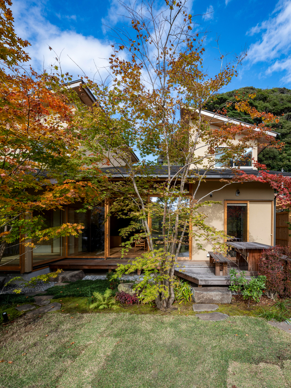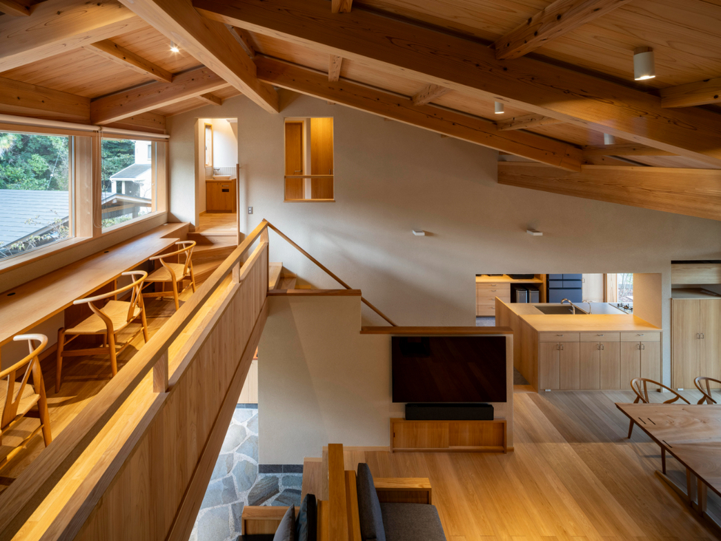 敷地が十分に広いため南側には芝生の庭、北には駐車スペースとアプローチを兼ねた庭をとり、北側に接する小高い山の緑を借景とするために居間の内部は北側が高い吹き抜けとした。海が近くマリンスポーツの仲間が訪れることもあるので、居間の北側の一段下がったところに暖炉のある石張床のサブリビングを設け、そのロフトを子ども達のスタディスペースとしている。