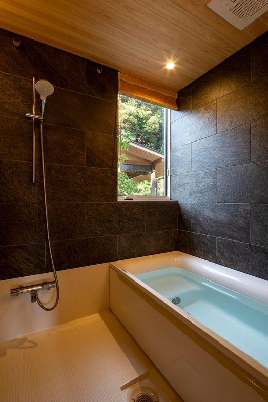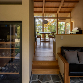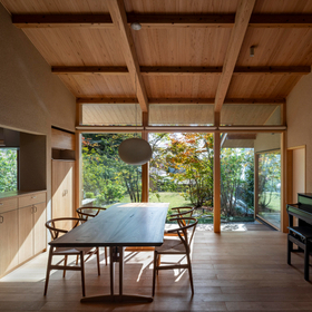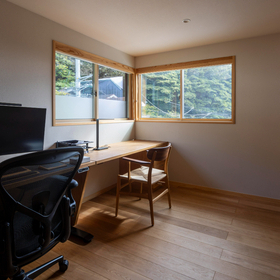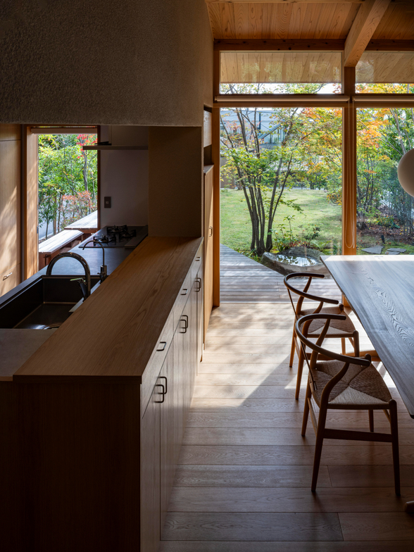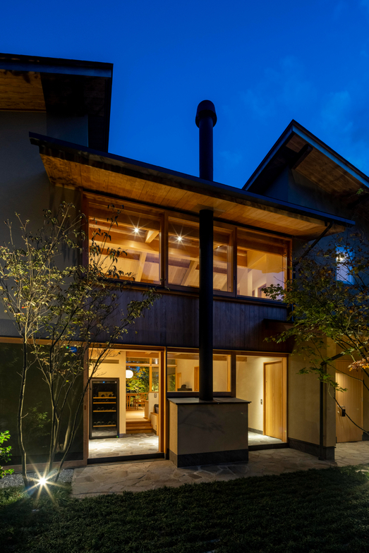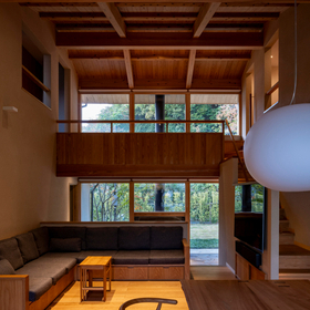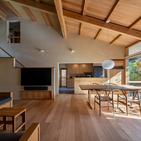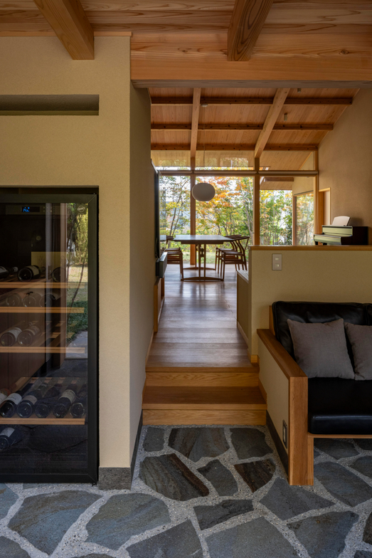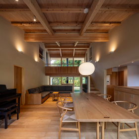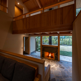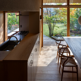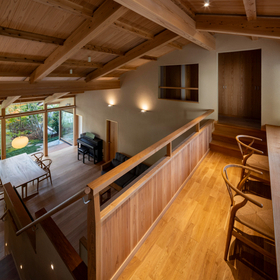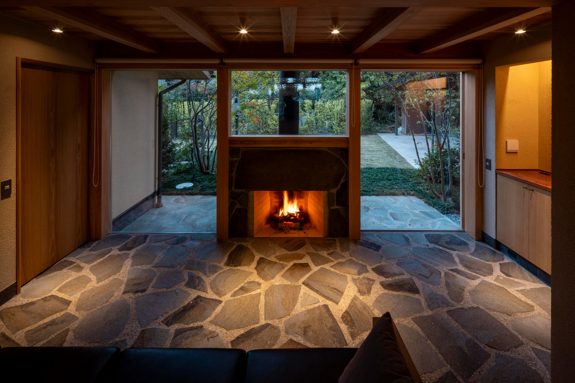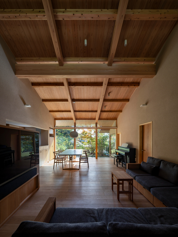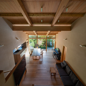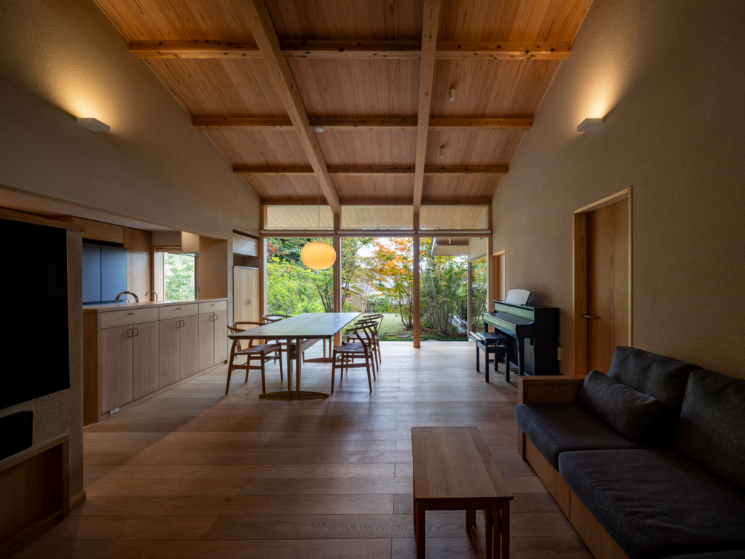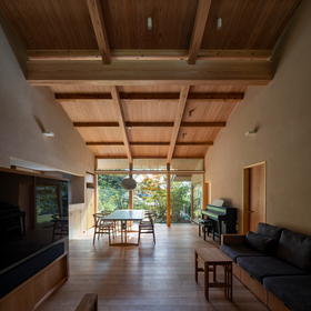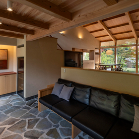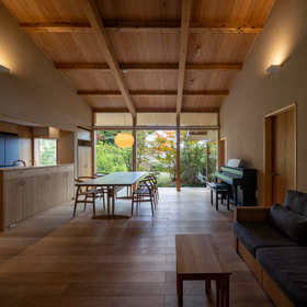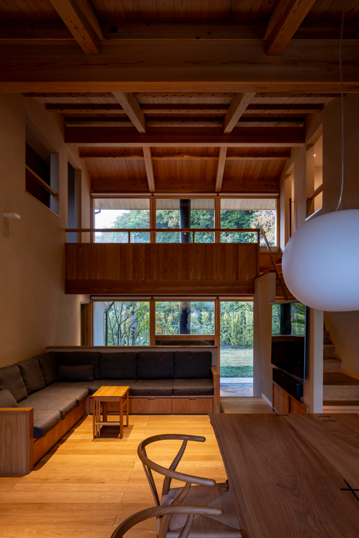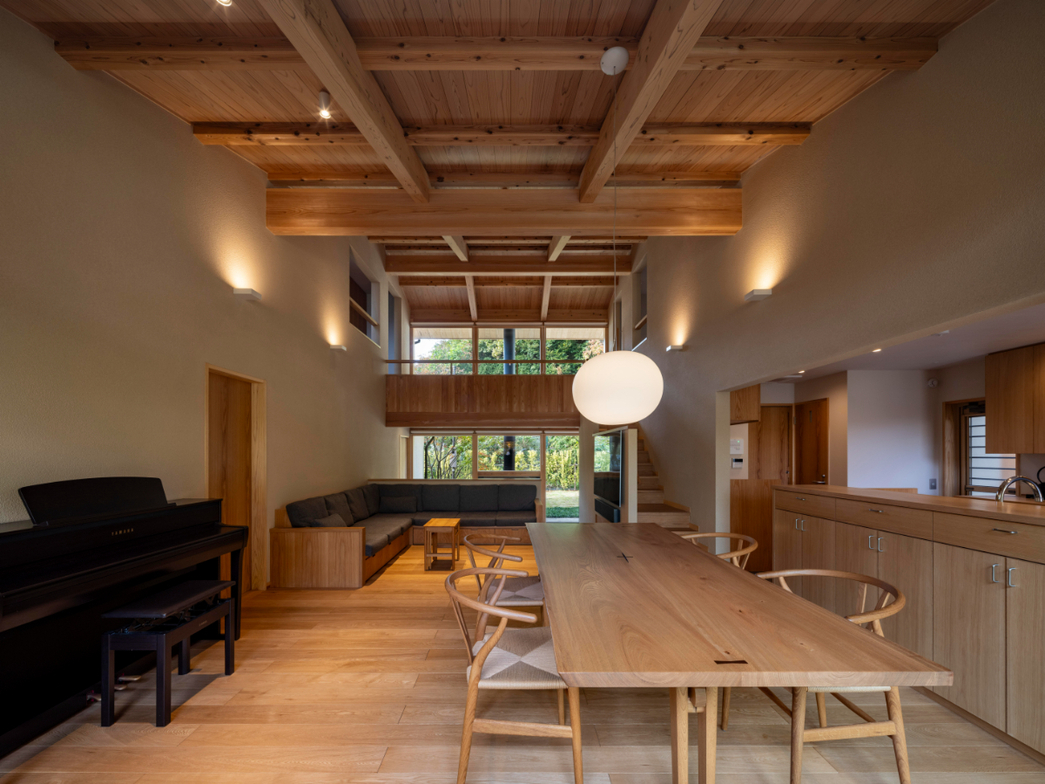 敷地が十分に広いため南側には芝生の庭、北には駐車スペースとアプローチを兼ねた庭をとり、北側に接する小高い山の緑を借景とするために居間の内部は北側が高い吹き抜けとした。海が近くマリンスポーツの仲間が訪れることもあるので、居間の北側の一段下がったところに暖炉のある石張床のサブリビングを設け、そのロフトを子ども達のスタディスペースとしている。