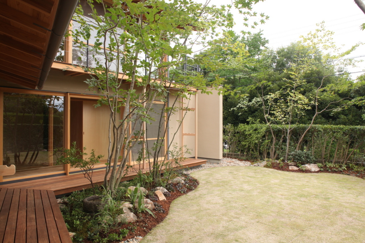 高台の角地にあり眺めが良いことから姉夫婦の主要室を2階に設け、1階の妹の居室は遠景を望めない代りに隣接する緑地を借景に落葉樹の庭がひとつながりになるように計画した。