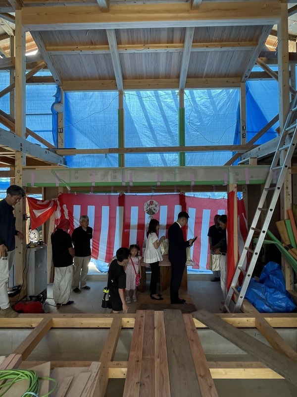 上棟式にてH様ご家族と一緒に四方祓いをし、工事の安全祈願を行いました。
