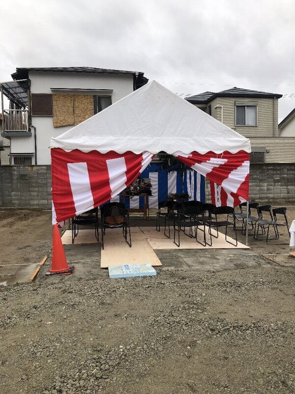 棟木にかすがいを打込み、御幣を掲げ、全員で工事の無事を祈願しました。