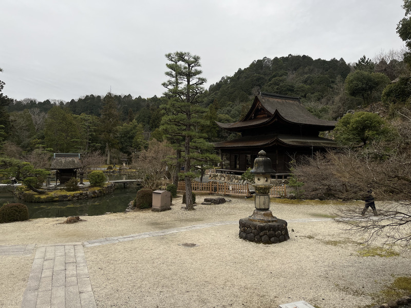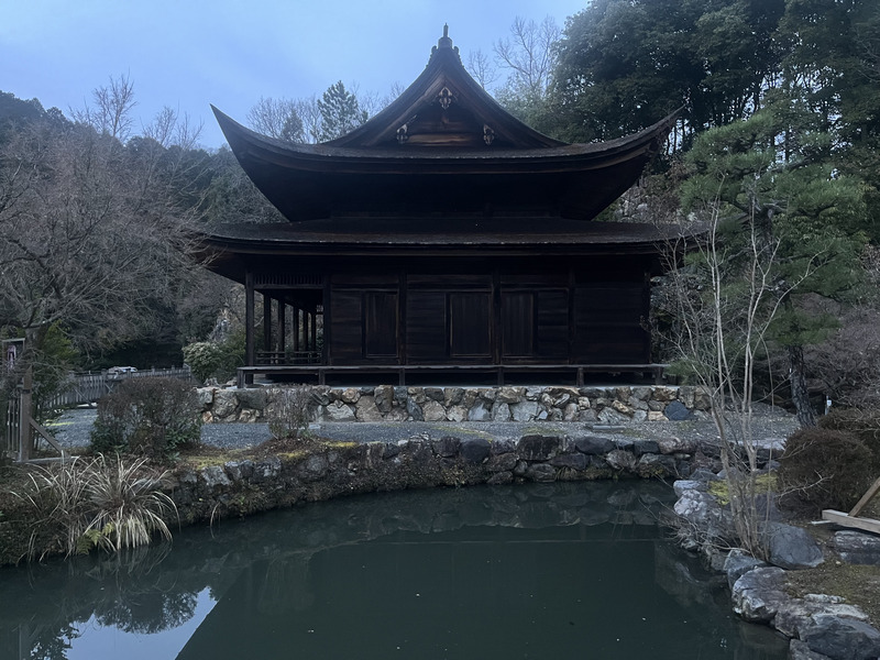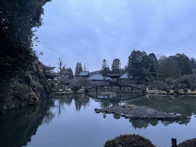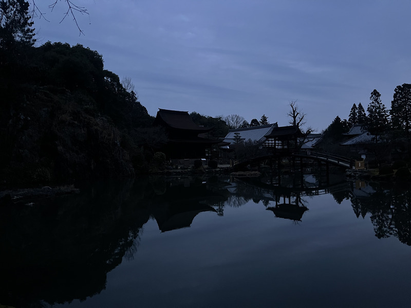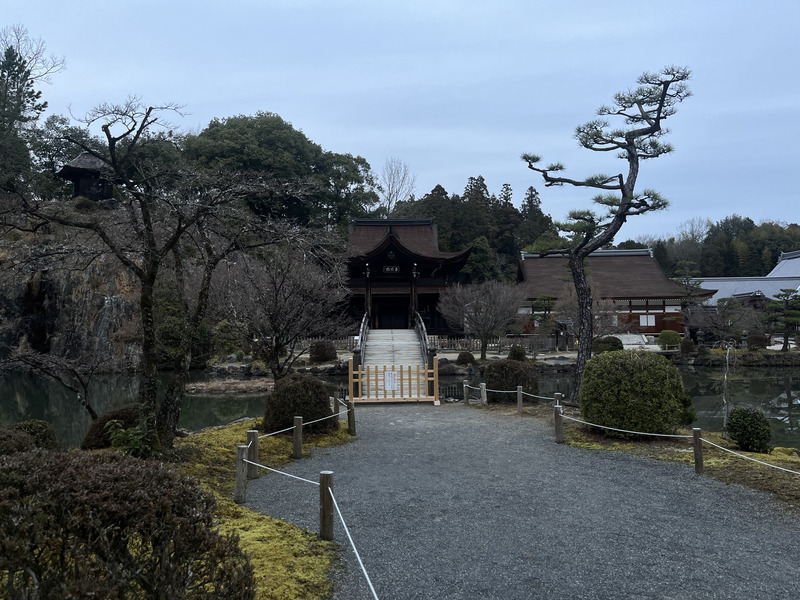 ある点で池に架かる橋の屋根と、奥の観音堂の屋根が重なり一体となります。