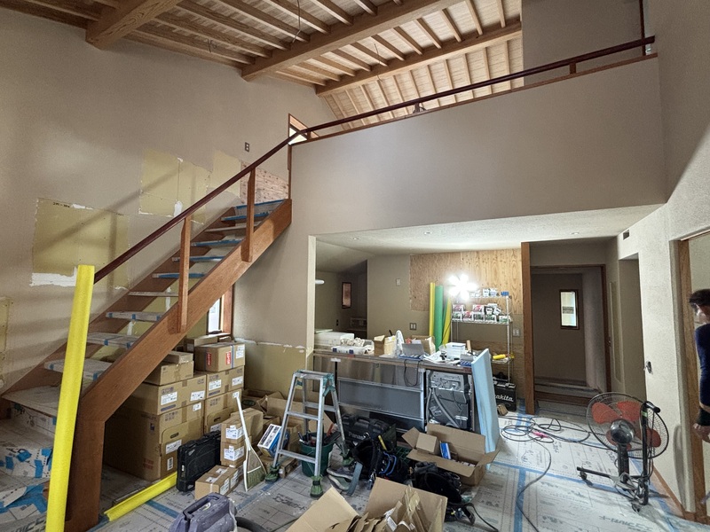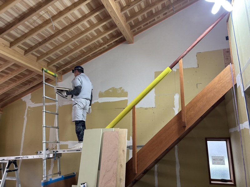 吹抜けの上部は梯子をかけたり、内部足場を立てたりして塗っていきます。