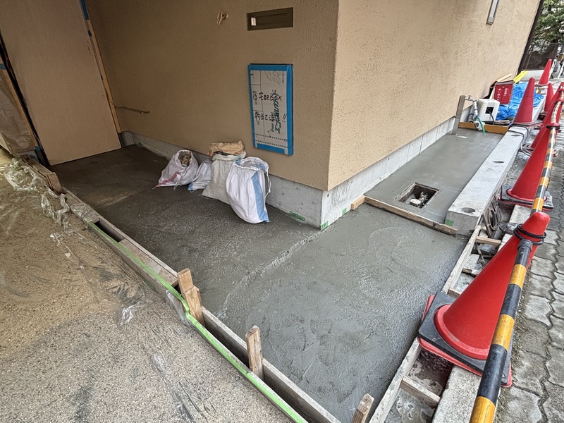 玄関戸の前は、鉄平石貼りの仕上げとなる予定です。