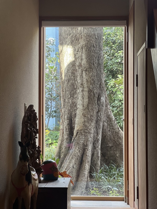 階段横はお庭に出るための勝手口あり、そこから大木の幹が見えます。
