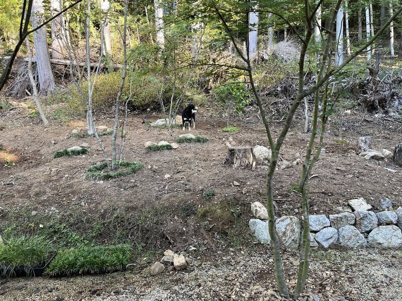 芝生の右側の裸地にはクローバーとワイルドフラワーの種をまきました。来年の春には緑が広がっているといいな。