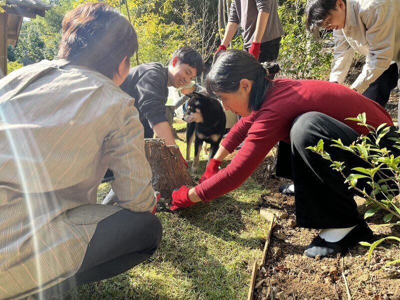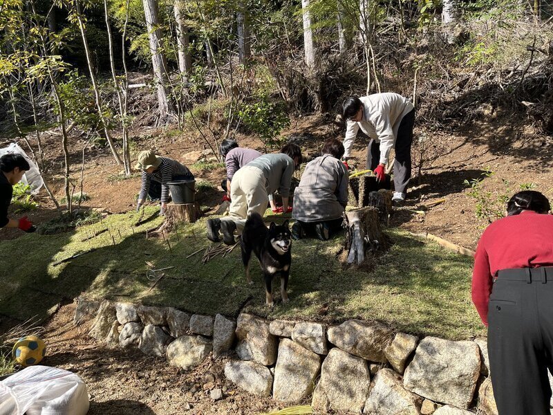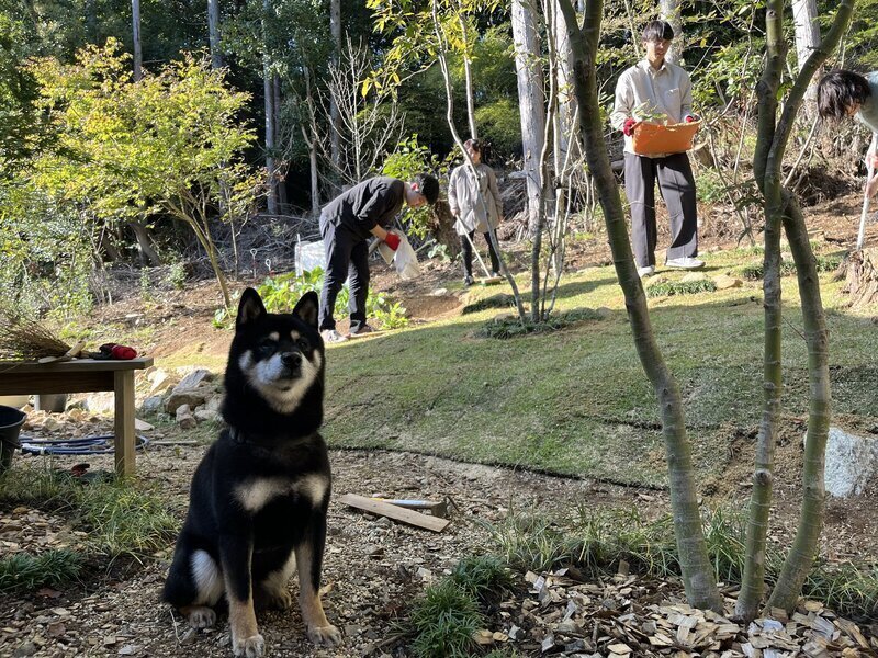 みんな手仕事派人間だから石の際や切り株との取り合いとかすっごくきれいに芝をカットして納めてた。スタッフ・増田は熟練職人らしく芝のひかりつけ(←数寄屋大工の技)って言ってた。