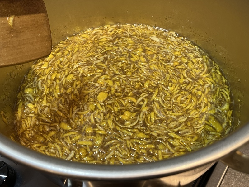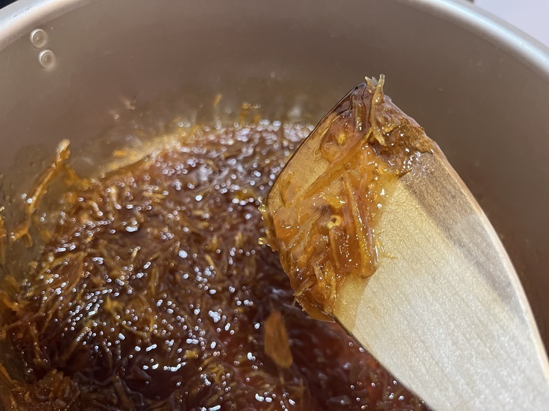 大きな鍋でほぼ同量の砂糖とともに煮ていきます。
