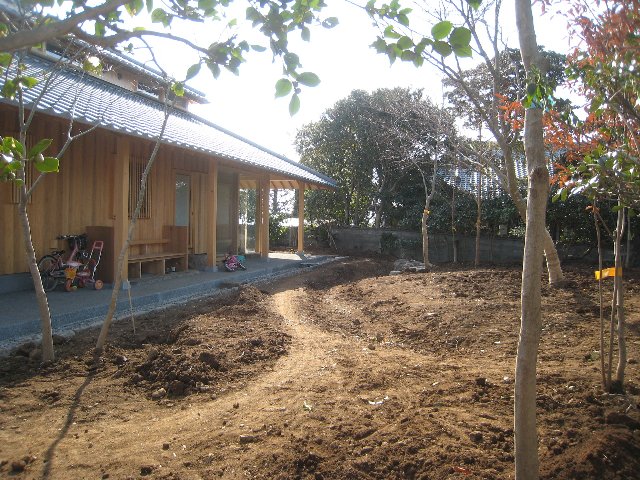 大きな樹木を植えています。そのわきに添え木を入れ、