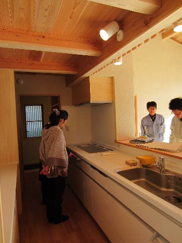 奥さまはシステムキッチンの取り扱い説明を受けています。