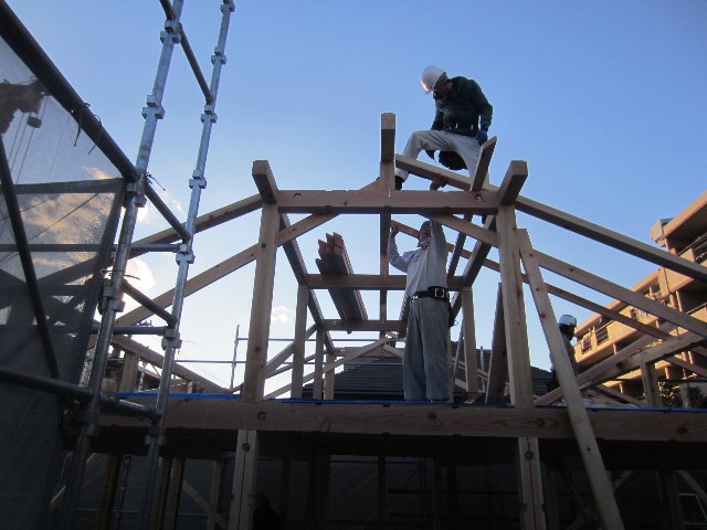 大工さん達が一斉に南面の垂木掛けにかかりました。